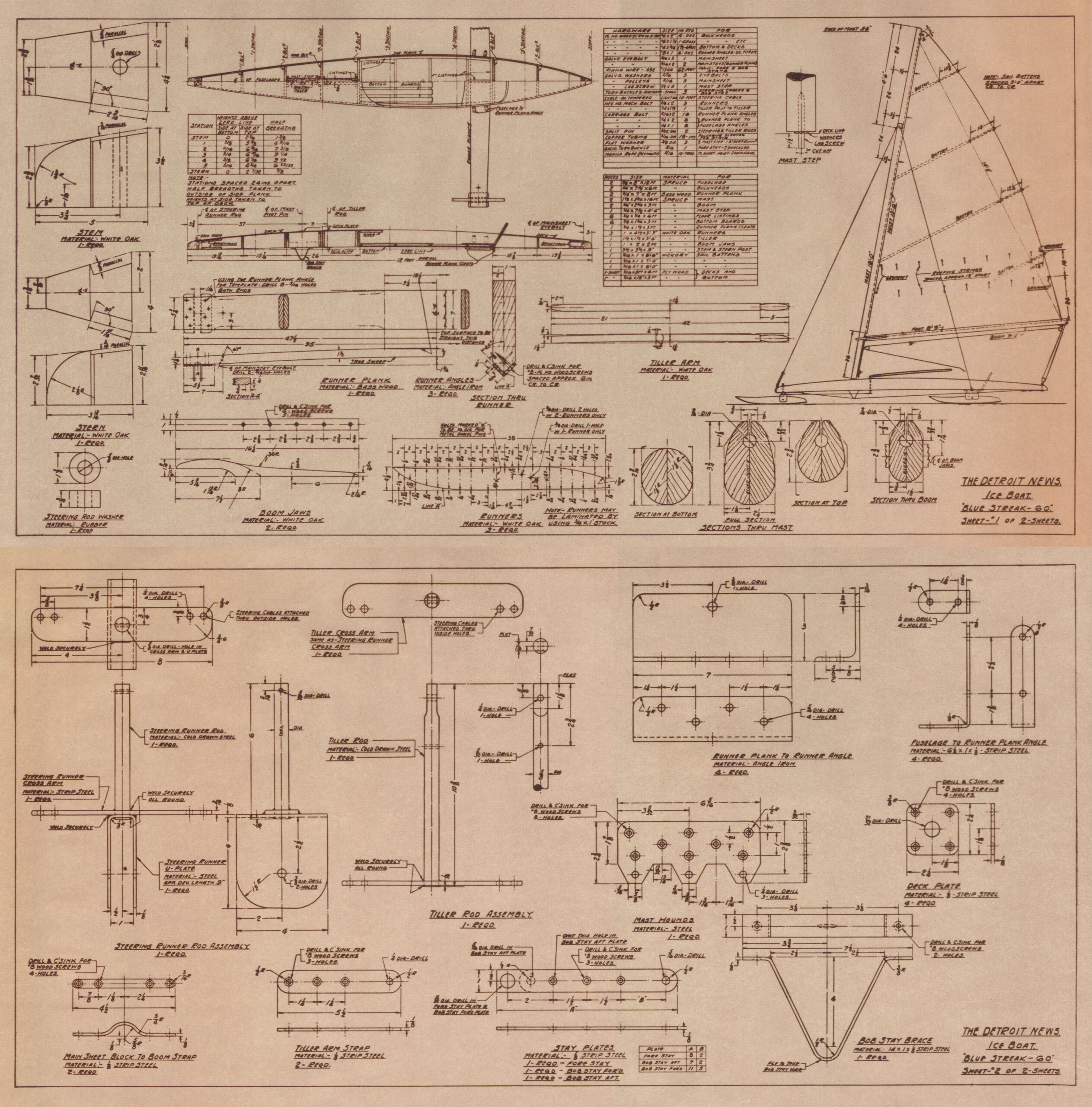 By the 1930s, with the US in deep depression, a need emerged for an inexpensive home-buildable iceboat that can be assembled out of common lumber and simple hardware. Size and weight were also important aspects so that the iceboat could be easily loaded on the roof of a car, or fit it in the bed of a pickup truck. Such a blueprint won the Detroit News sponsored ice boat design contest in 1937. The prototype excelled on its test run, especially in light wind where many of its massive counterparts could not even move. That year the newspaper opened up its hobby shop to 50 builders who assembled the first fleet of these “Blue Streak 60” iceboats (as DNs were originally called).