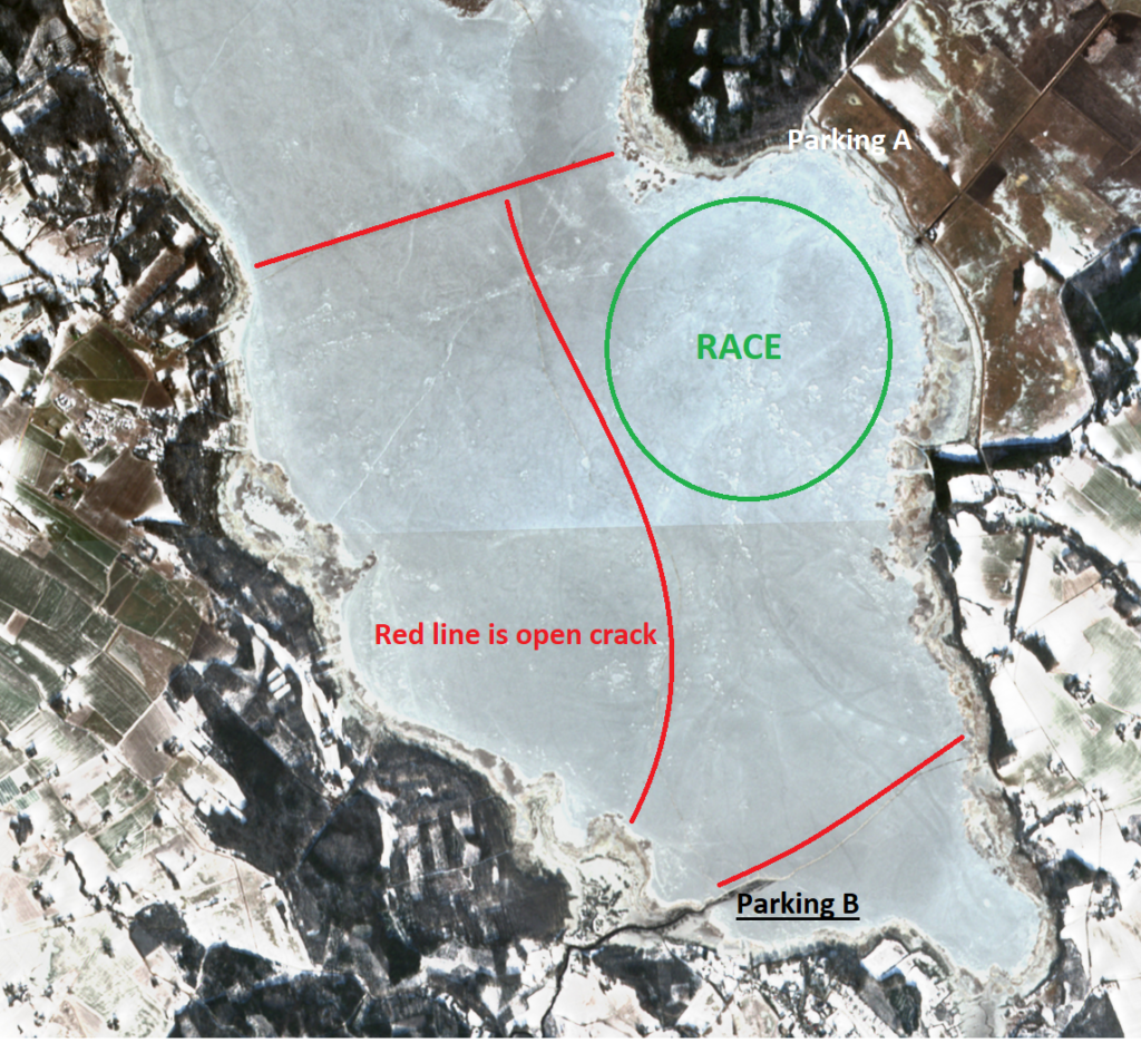 The area in the white circle is deemed safe. The blue line shows a crack that is safe to sail across now but it will be safe be on the racecourse tomorrow. waiting for wind. You can come out and have fun. Sausagefest at 12.00